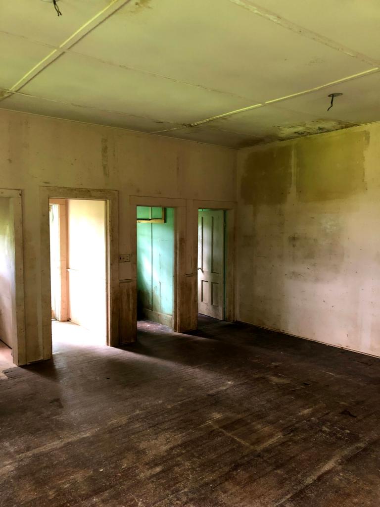 Right at the beginning we started to slowly peel away what we could on the interior. Our goal was to preserve what we could, salvage what was still viable and discard what couldn’t be saved. After years of weathering the elements, without being properly sealed, it was not possible to save any of the drywall or plaster except the vestibule; the only room with walls not directly against the exterior. The plaster elsewhere was cracked, water stained and barely hanging on the structure. This meant several weekends of work removing drywall, taking down trim and the most time-consuming part of the demolition, taking down all the plaster and lath board. We both agreed that we needed to take our time, which was the right decision in the end, but it was exhausting work. Once we started taking down the drywall on the roadside wall, we found rolled up bits of newspaper shoved behind the drywall as shims and shoved in a few cracks. There were several whole pages that ended up being well preserved, helping us date when the drywall was installed.